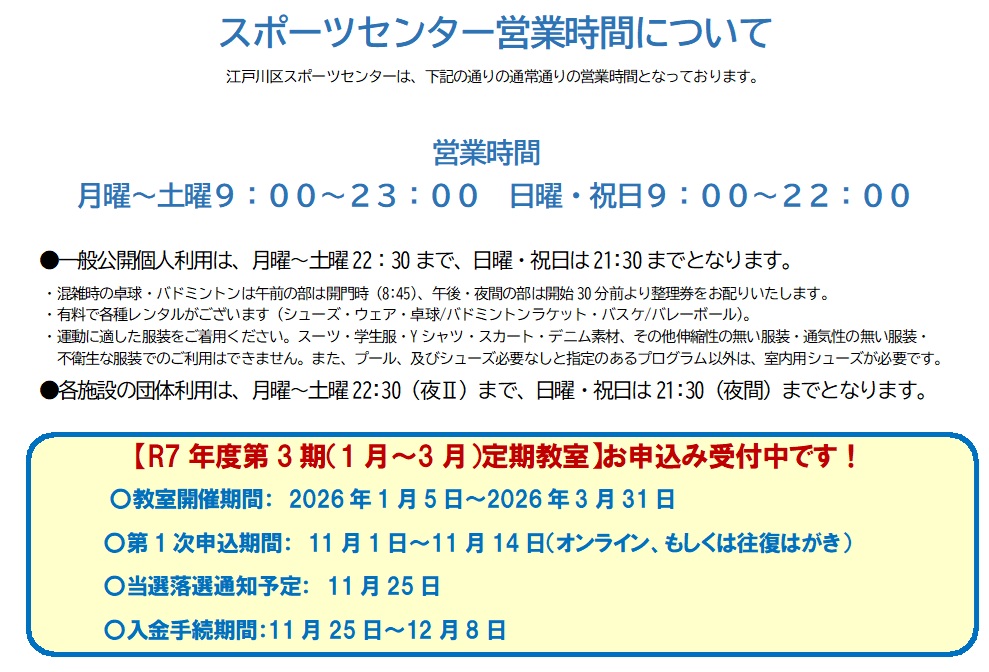 江戸川区スポーツセンターでは温水プール、体育館、トレーニング室、卓球室などで一般開放を行っています。また、各種スクールプログラムをご用意しておりますので、いつでもお好きな時間に気軽にご利用ください。